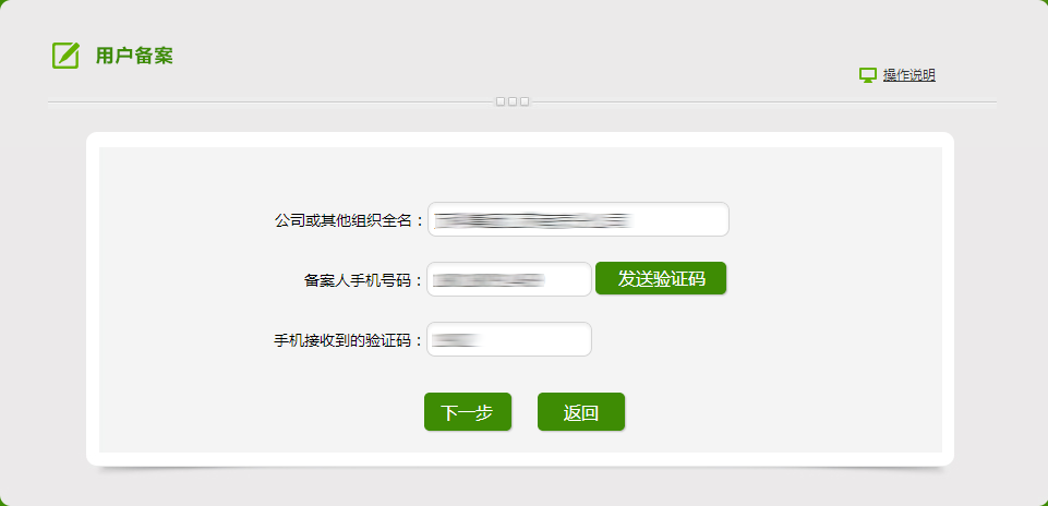 (1)进入系统首页,点击【备案】按钮进入备案页面,填写相关信息,进行企业备案,分为有统一社会信用代码和有组织机构代码两种注册方式。