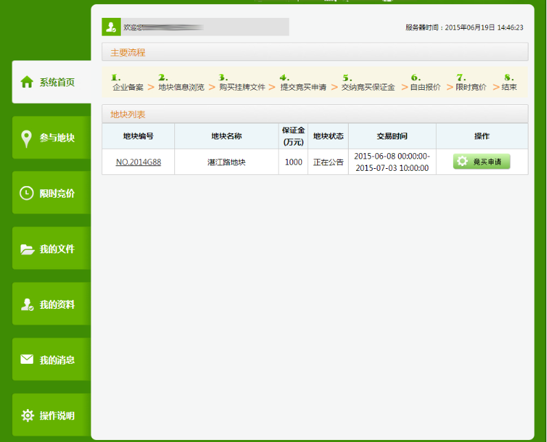 (1)进入系统首页,包含参与地块、限时竞价、我的文件等。
