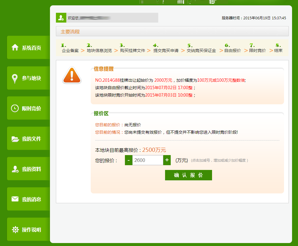 (2)在自由竞价时,初始报价可等于该出让地块的起始价,之后的报价必须满足规定的加价幅度,否则报价无效,系统拒绝接受报价信息。 竞买人可通过点击 + - 控制报价,每点击一次表示增加