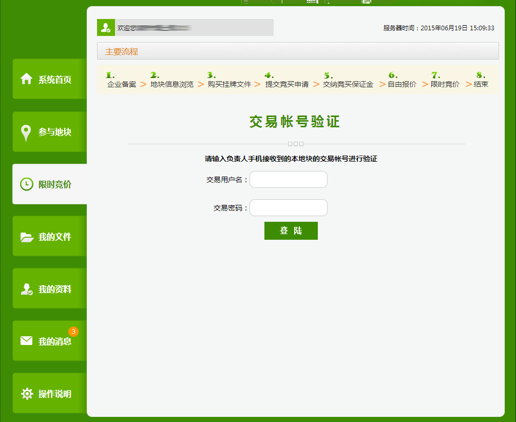 (1)当竞买人竞买报名通过审核具备竞买资格后,将收到使用短信通知的交易用户名和交易密码,点击【限时竞价】按钮,将此信息填入交易账号验证区域,点击【登录】按钮即可。